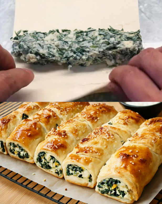 - Spoon the spinach and cheese mixture onto each square of puff pastry. Roll up the pastry tightly and place seam side down on the prepared baking sheet.